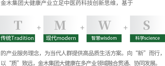 金木集团大健康产业立足中医药科技创新思维,基于T(传统Traditional)+M(现代modern)+W(智慧wisdom)+S(科学science)的产业服务理念,为当代人群提供高品质生活方案。向 “新” 而行,以 “质” 致远,金木集团大健康在多产业领域融合贯通、协同发展。